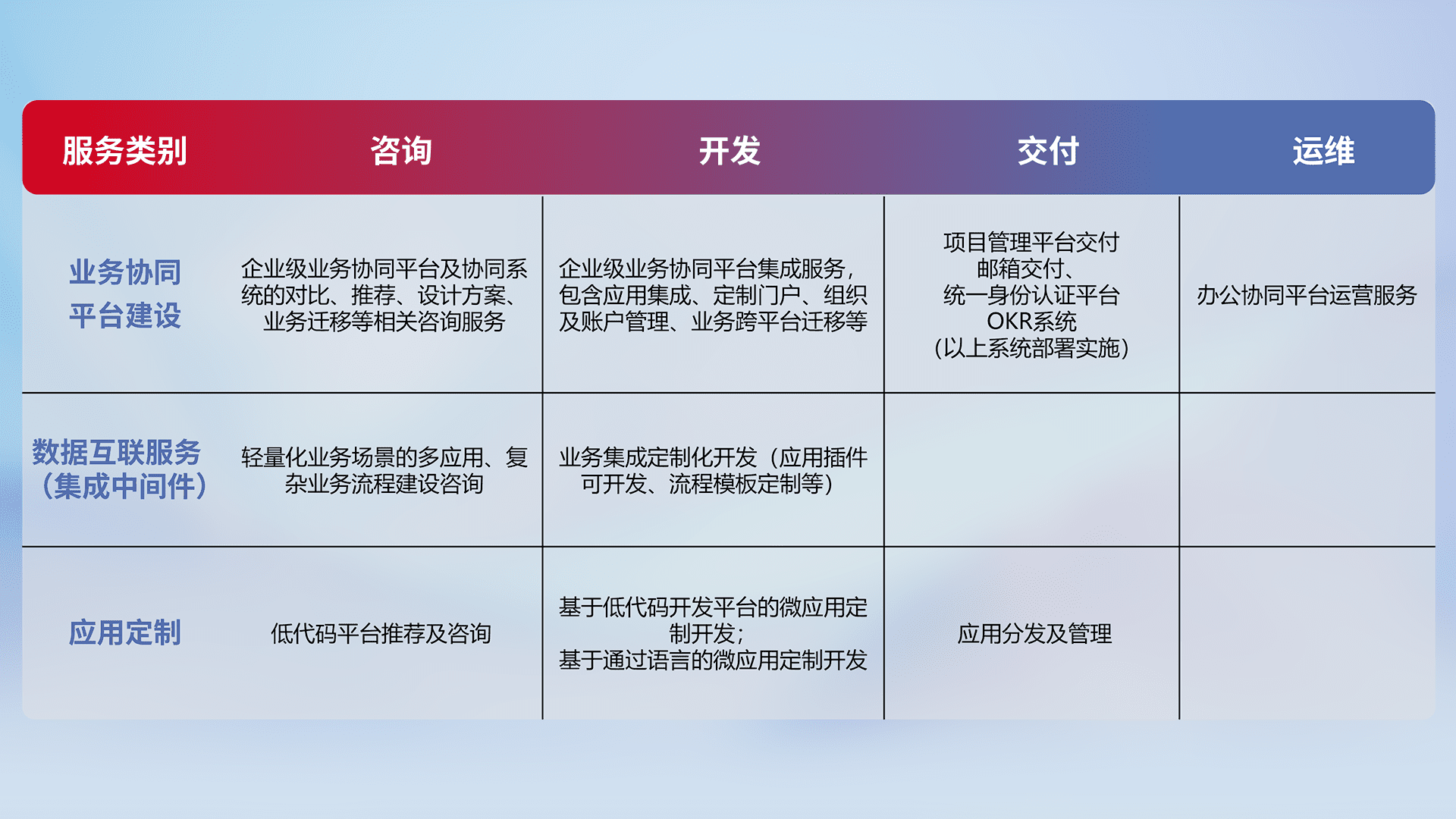 针对钉钉、、企微、、、IDaas等平台级产品提供产品的规划、、、方案、、、、交付、、定制化开发等服务,,实现如统一协同办公、、、智能客户服务、、、、混合会议管理、、智能数据查询、、、等业务场景,,,,实现数字化转型。。