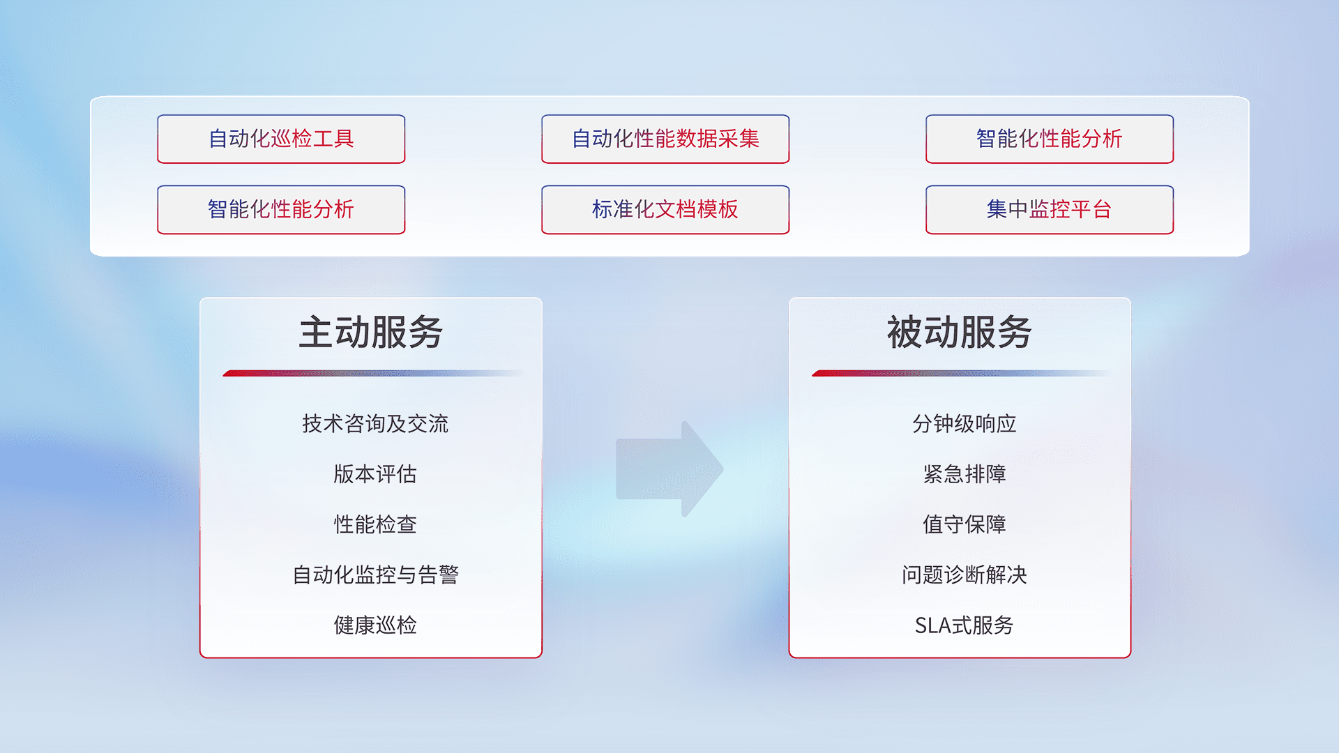 智能化工具和标准化文档,,,保障服务质量,,提供主动服务(包含技术咨询、、、版本评估、、性能检查、、自动化监控与告警、、健康巡检)和被动服务包含(分钟级响应、、紧急排障、、、值守保障、、、、问题诊断解决、、、SLA服务)。。。