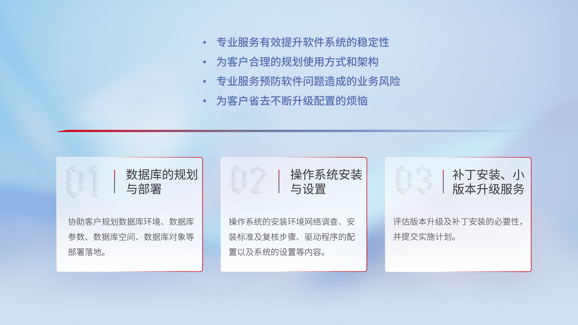为客户提供软件规模升级、、、、快速部署、、、、按需配置的专业服务,,,从数据库的规划与部署到操作系统的安装与设置,,,再到补丁安装和小版本升级提供支持。。。