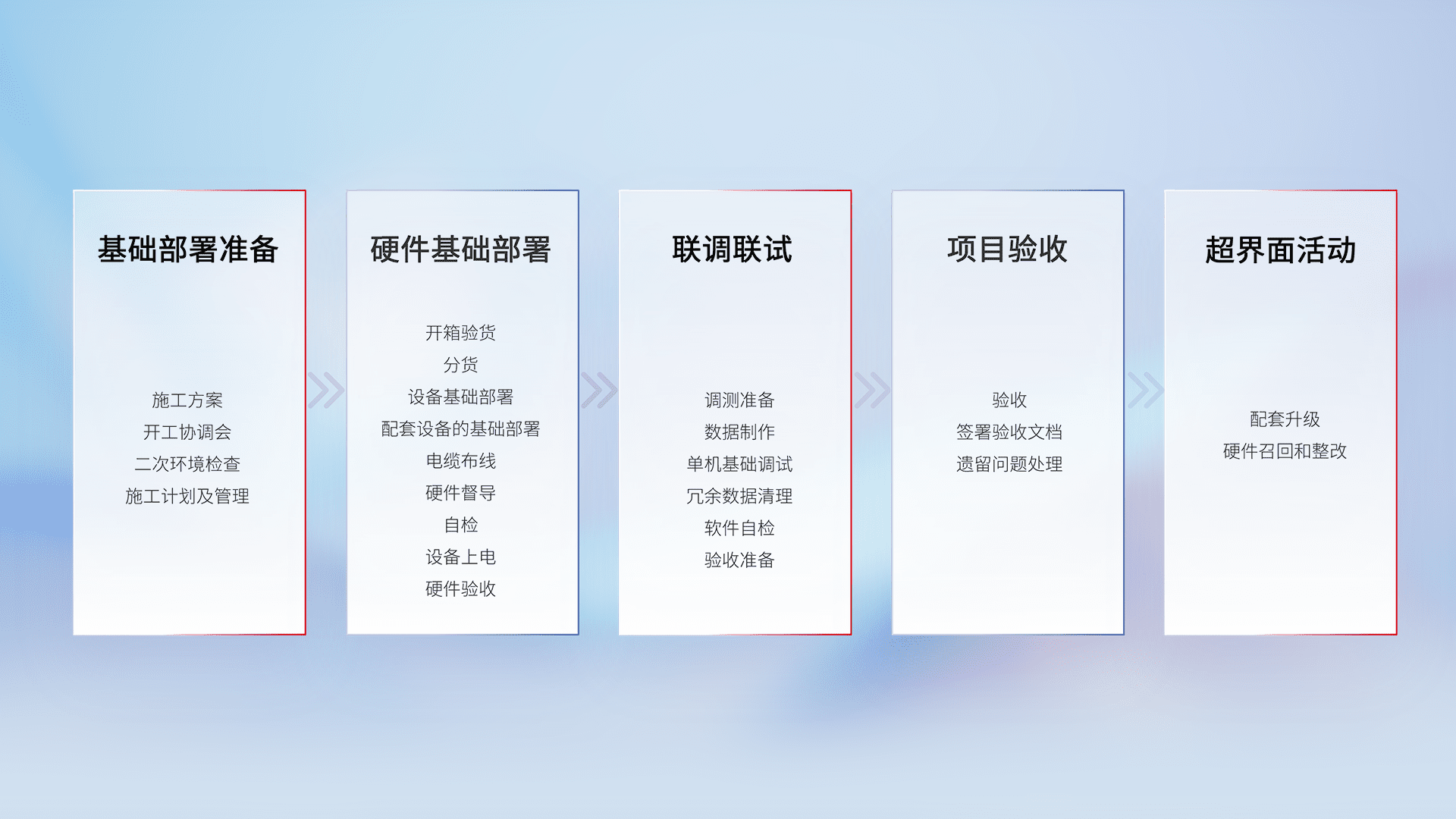 从基础部署准备、、、、硬件基础部署、、联调联试、、项目验收、、、越界面活动的全过程可追溯,,,保证施工质量和进度。。